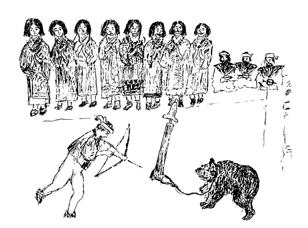 As soon as all is secure the blunt arrows are shot with renewed vigour, and the beast tears and rages till it is quite tired out. Then comes the most exciting time and true test of valour. All at once some braye young Ainu will rush forward and seize the brute by the ears and fur of the face, whilst another suddenly rushes out and seizes it by the hind quarters. These men both pull at the animal with all their might. mouth.