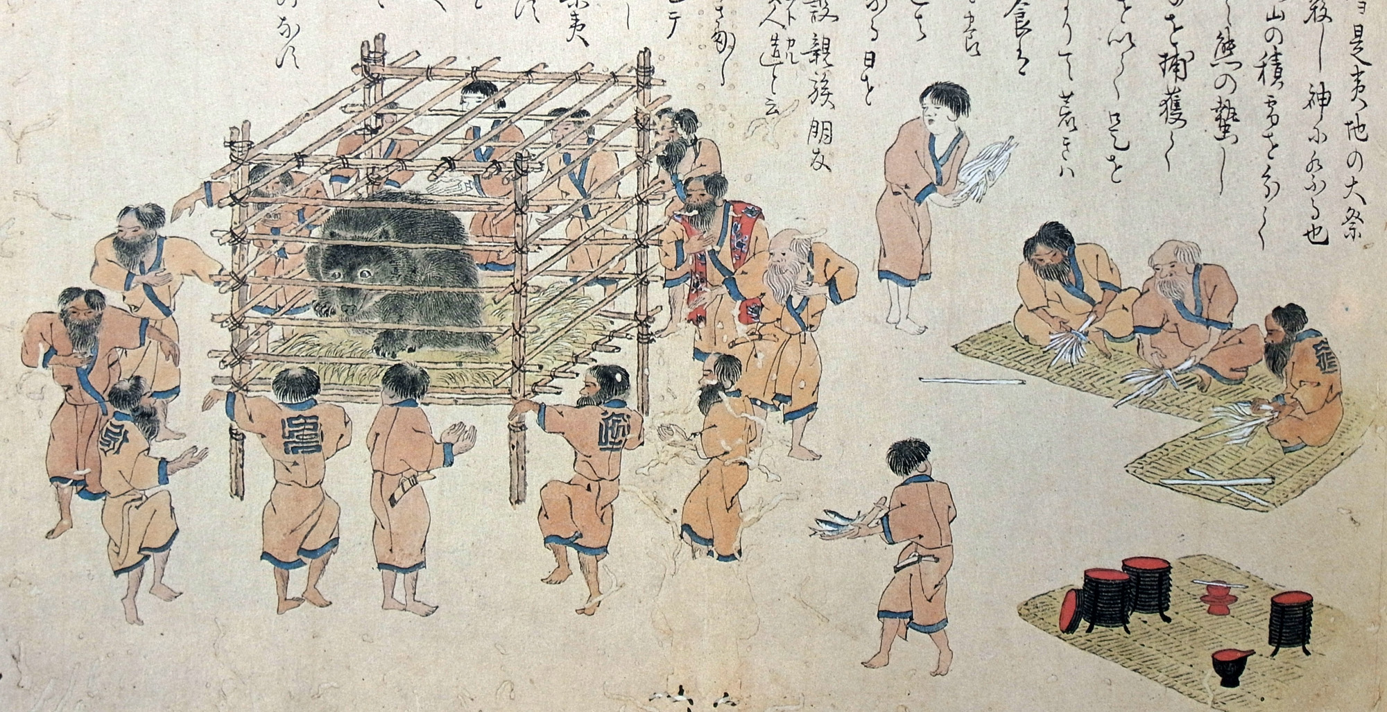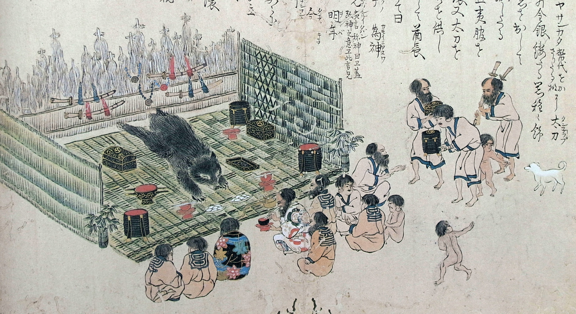 扨、殺したる熊を中央に置、夷服を著さしめ、耳環、又太刀を帯さしめ、酒食を供し、