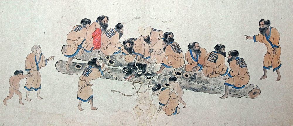 突然勇敢な若いアイヌが突進し、クマの耳と顔の毛をつかみ、他方別のアイヌが突然突進し、そのお尻の部位をつかむ。