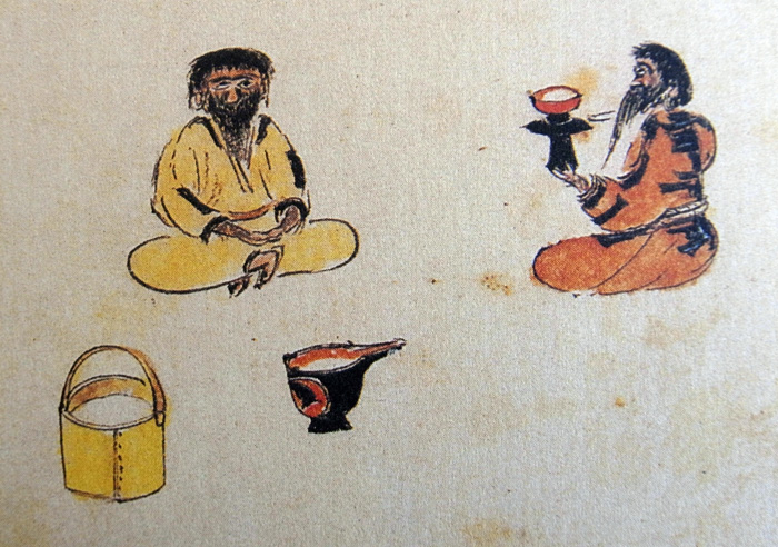 先、文席(アヤキナ) (ガマで編んだ花ゴザ) を敷、客相對して両人の中央に行器(ケマコルシントク) 酒を湛如し柄杓を添る (ドウキ)(タカイシヤラ)を置、飲箸(イクパシ)を盃上におきて、客数人にしたかひ酒器のまうけ如圖。