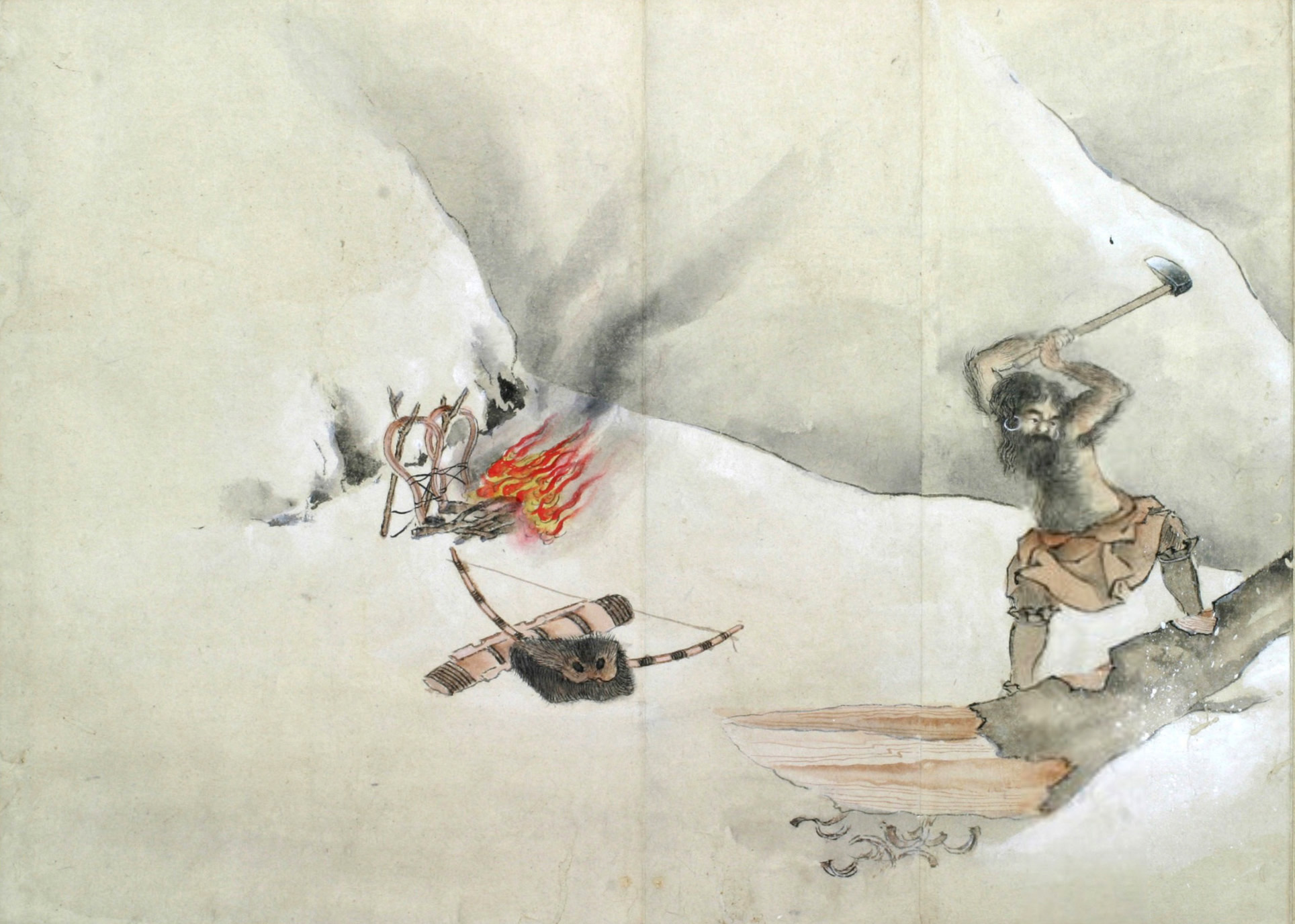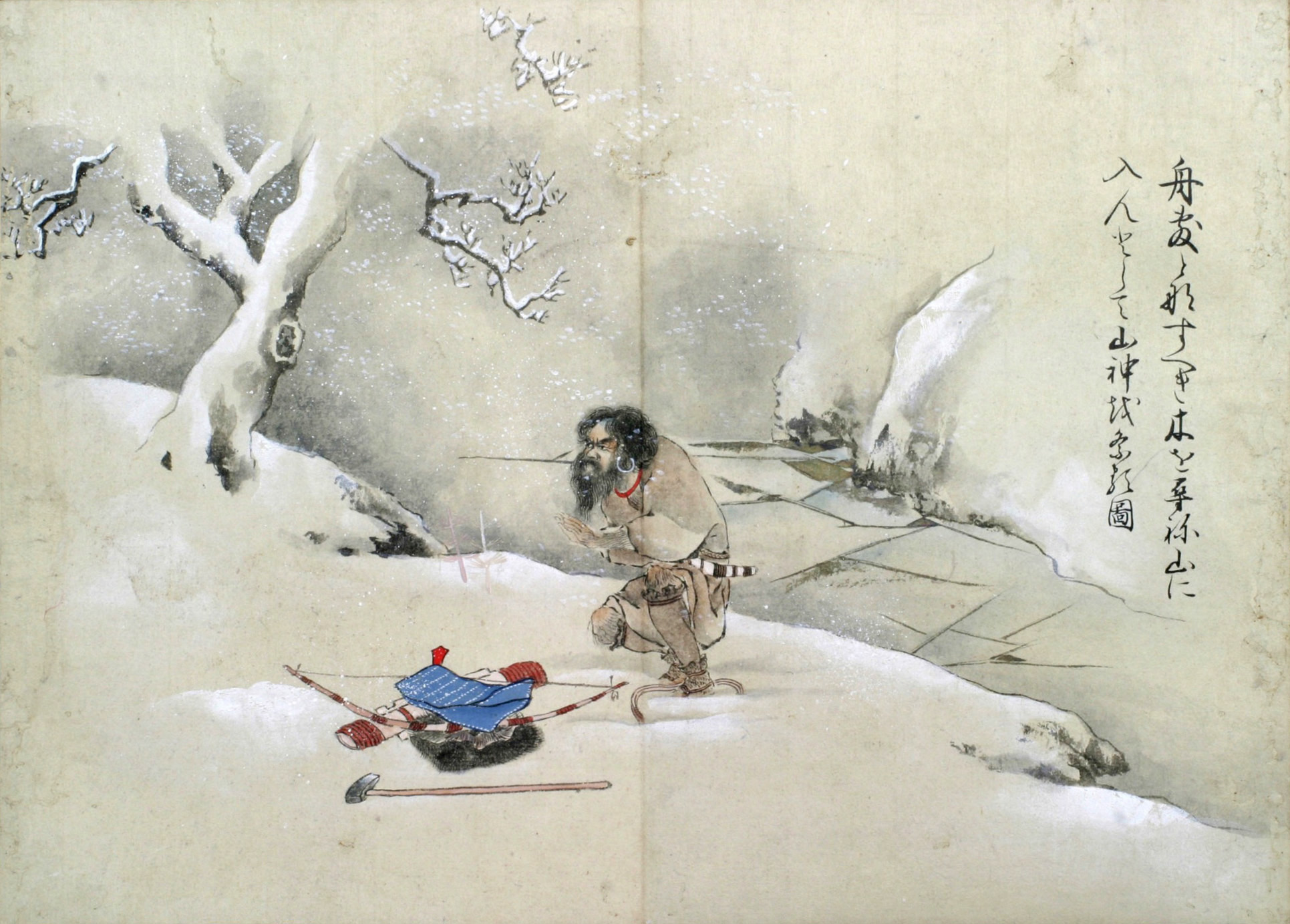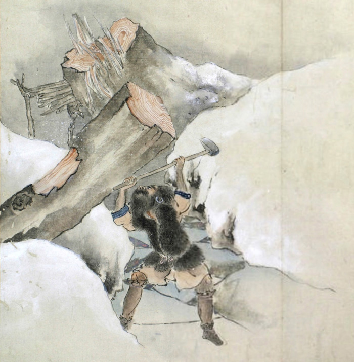 舟敷となすべき木を尋ね山に入んとして山神を祭る圖