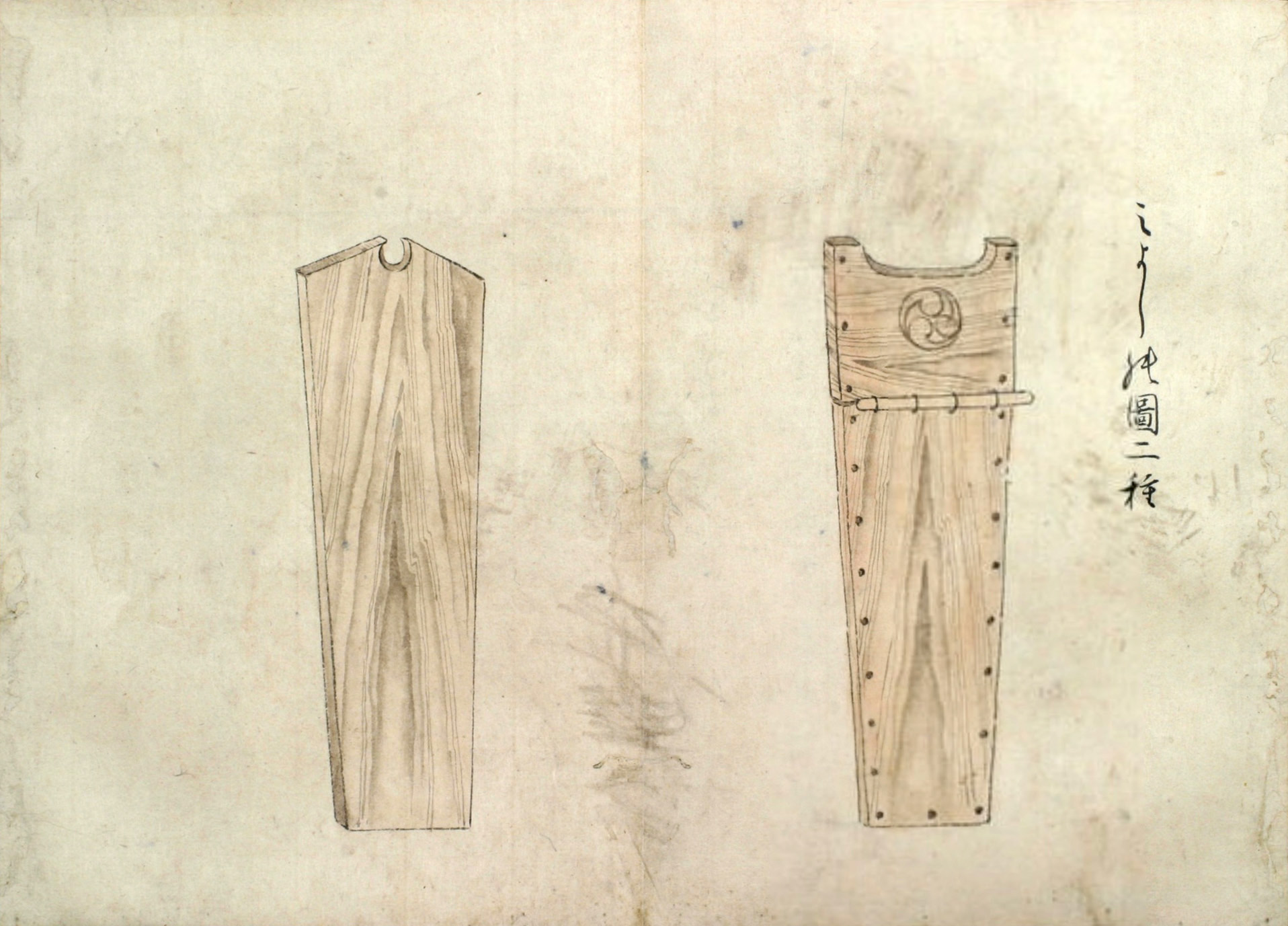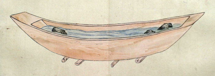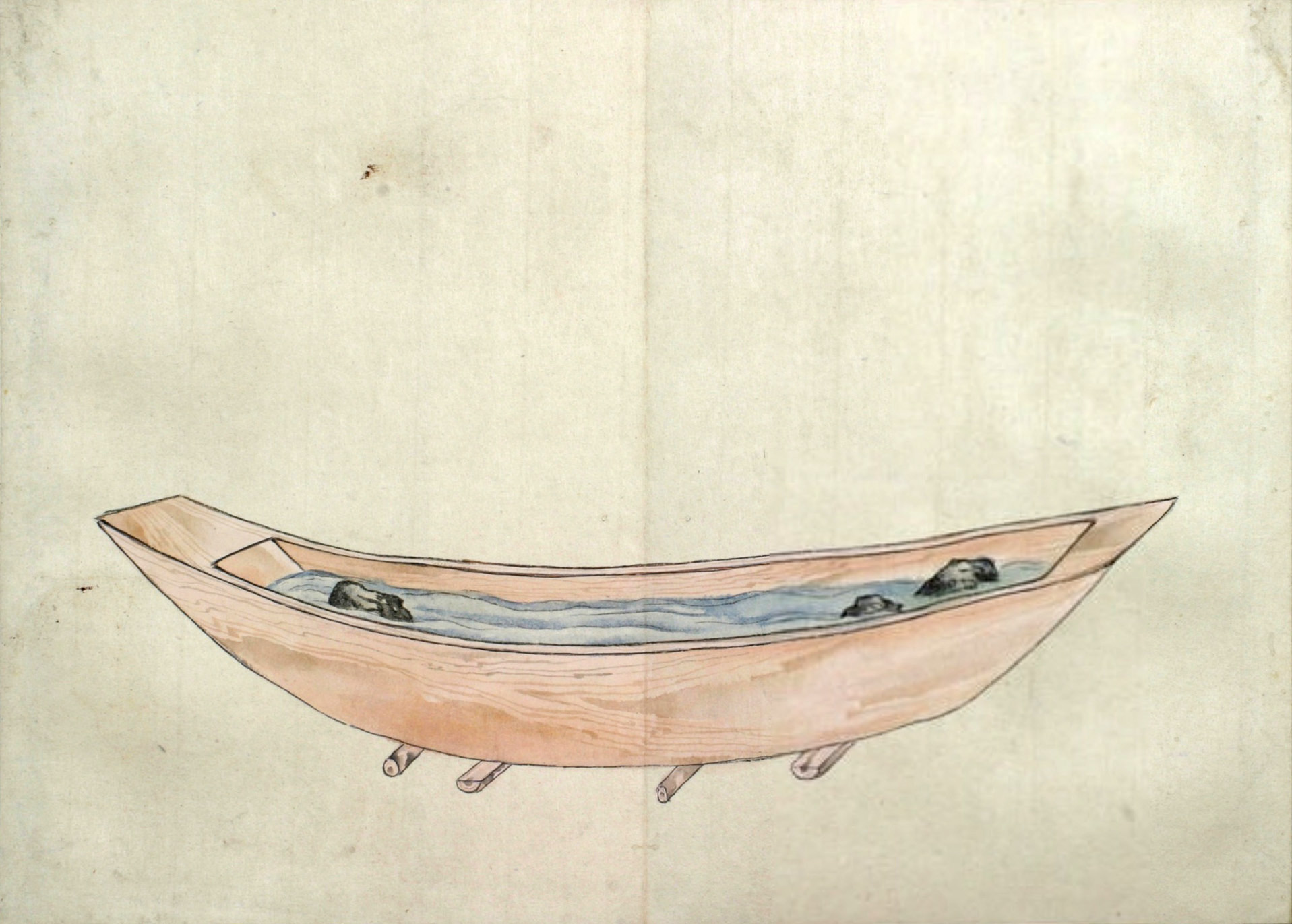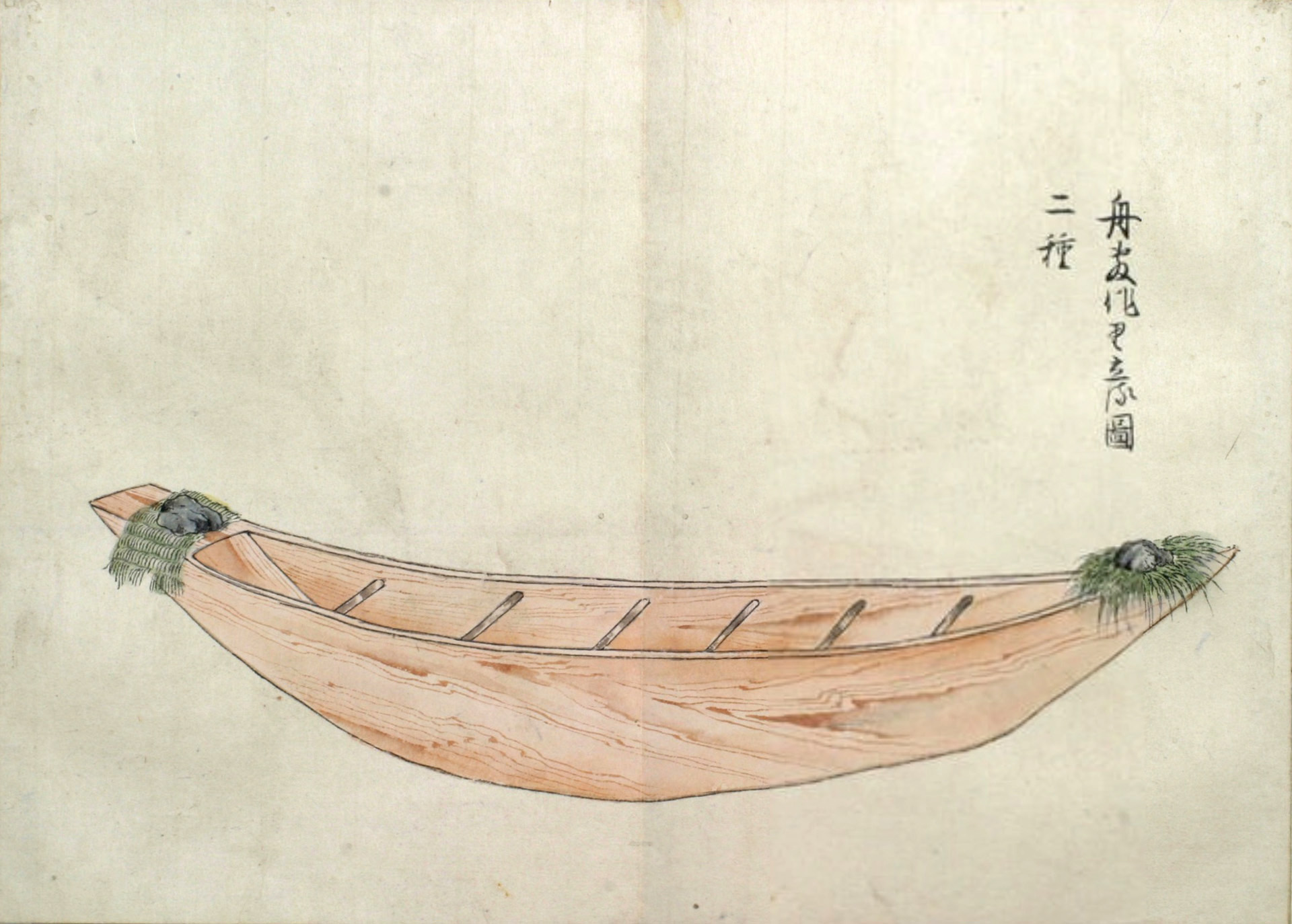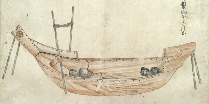 まづ‥‥敷の両縁のうちに横木をいれ、内えしぼまざるよふになし、また舳、艫に莚よふの物を厚く巻き、ひゞの入り損せざるよふにして幾日とい