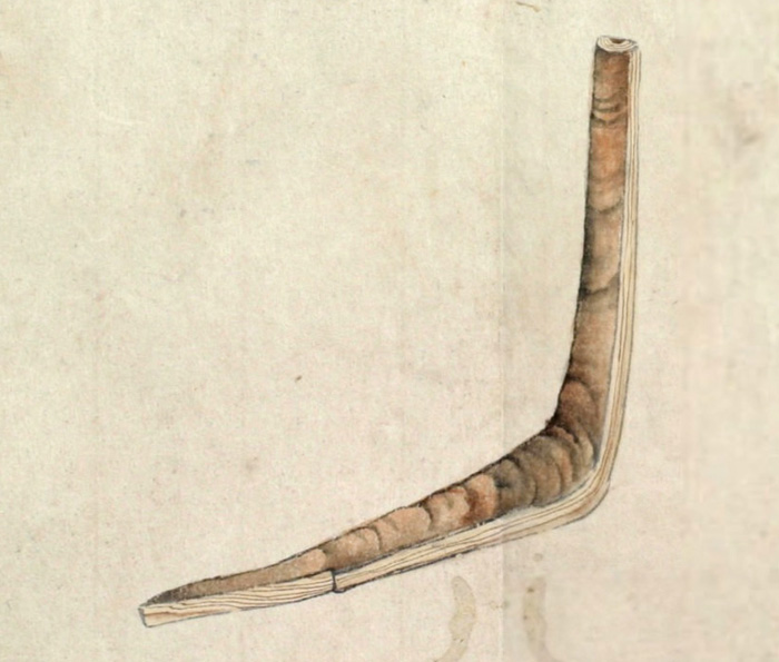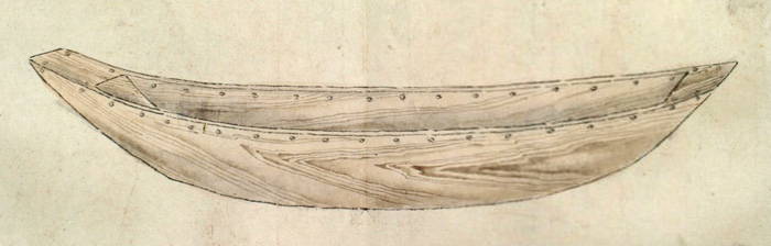 川用の丸木舟[チプ] は一本の丸太を削り込んで作られ、一艚作るのに二人で五日もあればできるが、長さが25フィート[7.5メートル]あるこの舟を調べてみると、舟は二つの部分からなり、舳先から艫までずっと非常に強力な樹皮でつながれていて、舟縁も同じようにつなぎ合わせて高くしてあることがわかった。