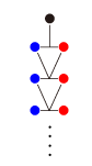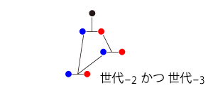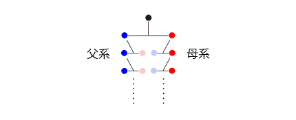 「100億人口の地球が,10万個必要」という数である。 はて,どうなっているのか? 答えは,「<父・母>溯行図の個体には,重複がある」である。 この重複が,先祖溯行したときの<先祖数の爆発的増加>を相殺している。 ──つぎは,最も簡単/極端な場合 (2個体集団の近親配偶):