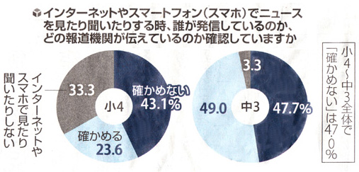読売新聞社と電通総研が小学4年〜中学3年の計約 6300人に共同で実施した調査で、日常的にスマートフォンなどでSNSからニュースを得ている児童・生徒が 56.3%に上ることが明らかになった。 半数近い 47.0%は、誰が情報を発信したのか、情報源を確かめていないこともわかった。