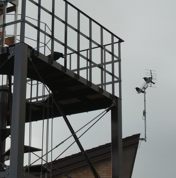 なわばりが隣合うカラスは,なわばりを経営する相手の行動に対して,譲歩できるところは譲歩していることになる。 実際,ボソ (以下「ボソ」) と隣のハシブトガラス (以下「ブト」) は互いの関係をいろいろな行動で現すが,その行動のうちには「隣付き合い」の観点に立たないと解釈できないものがある。 最も顕著なのが,繁殖に失敗すると,即なわばりの開放になることである。 ボソのなわばりは,育雛期間は絶対であって,ブトが入ってくることはない。 しかし,ボソが育雛に失敗すると,ブトがボソのなわばりの中にふつうにいるようになる。 「隣付き合い」は,餌についても見られる。 ボソをケーススタディにしている本研究は,「餌」を手法の1つにしている。 ブトは,ボソの餌を自分も得たいと思う。 餌をめぐってボソとブトが現す行動パターンは,一様ではない。 そして一様にならない理由の1つが,<餌に対するブトの欲求度>であるように見える。 2023年度は,ボソが育雛に失敗した。 一方ブトは,7月5日の時点で,雛3頭の巣外育雛に入ったところである。 雛3頭を育てるのは,たいへんである。 というわけで,いまのブトは,ボソの餌を自分も得たいという欲求が強いことになる。 実際,ボソの餌を取ろうとする行動を,現してくる。 興味深いのは,この場合,ボソがブトを強くはねつけようとしないことである。 ここでは,ボソのそのような行動の一つ示す。 餌置き場を,つぎのように設ける: