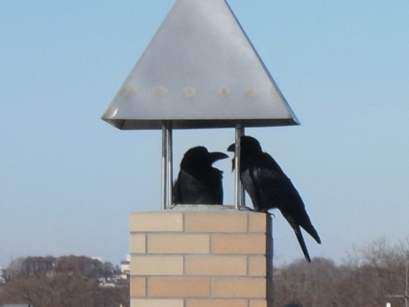 隣のカラスは,繁殖期には自分のなわばりに籠もり,うち (ボソ のなわばり) の方には姿を現さない。
