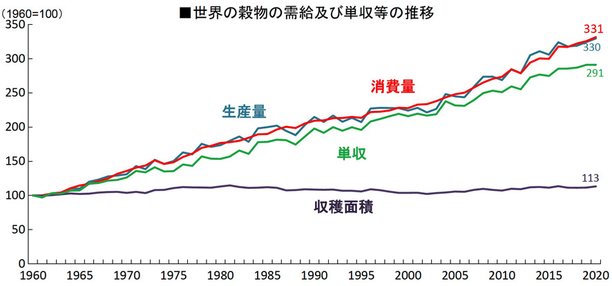 生産量の<3倍以上>は,単収の<3倍近く>で実現している。 ひとは,60年間で単収が3倍になっていることを聞くと,生産技術の「改良」の賜と受け取る。 ひとにとって,増えることは良いことだからである。 何か増えることは,かわりに何かが減っていることである。 ひとは,このトレードオフに考えが及ばない。 単収が増えているのは,つぎの2つのことをやっているからである: 土壌の酷使は,土壌劣化,そして不毛化 (サバク化) へと進む。 「60年間で単収が3倍」は,土壌劣化との引き換えなのである。 そして,既にサバク化と引き換えている所もある。 では,作物の人工化の方は,どこへ進むのか? 作物の人工化が向かう先は,化学肥料だけで育つ作物である。 そして化学肥料だけで育つ作物の先に展望されてくるのが,土壌無しの水栽培である。 農業が企業化できないのは,土壌が扱いに面倒だからである。 水で済めば,農業は企業化できる。 作物の人工化とその生育環境の人口化の問題は,「それは果たして食糧なのか?」である。 ひとは口に入るものは食糧だと思う。 しかし,食糧かどうかは,体がこれをどう受けつけるかという問題なのである。 人工化を突き進む作物栽培は,腸内微生物が欲しているものを欠いている可能性がある。 そのときは,腸内生態系が壊れ,体はアレルギー症状を多発するようになる。 そしてひとは,そのアレルギー症状が何であるのかわからない。
