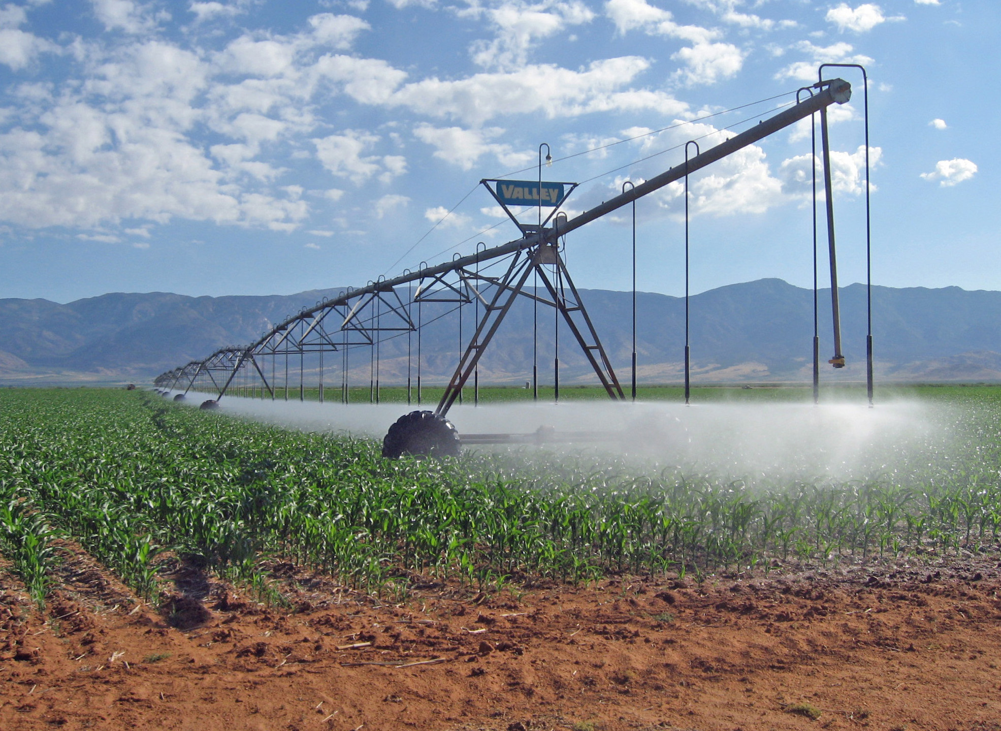水は,地下から汲み上げる。 乾燥地帯なのだが,西のロッキー山脈の雪解け水が,長い時間をかけてこの一帯の地下水をつくっている。 その地下水は,無尽ではない。 取水井戸は,水が取れなくなったら,さらに深くする。 この場合,500m くらいが限度になる。 そうなったら,その耕地は放棄することになる。 そして,別の耕地の開拓に向かうというわけである。 乾燥気候の日照は,裸の耕作放棄地を乾燥させる。 そこは植物の生えないところになる。 こうして,そこ一帯はサバク化する。 アメリカ西部で農業をするとは,乾燥裸地のサバクをつぎつぎとつくっていくことなのである。 サバクは,たまたま雨が降っても,恵みの雨とはならない。 地中に浸み入った水は,蒸発する。 このとき,地中の塩類を上方に吸い上げる。 そこは塩類が濃くなっていく。 そしてこうなると,水を引いてきても植物は育たない。 なぜか。 植物が水を吸うのは,細胞液が細胞の外の水より濃い (溶質濃度が高い) ためである。 水は溶質濃度の低い方から高い方へ移動する。 この物理のため,濃い塩水に曝された植物は,細胞の内から外に水が移動する。 こうして死んでしまうのである。 カリフォルニア州デスバレーの塩平原は,このタイプのサバク化の極みを示している。