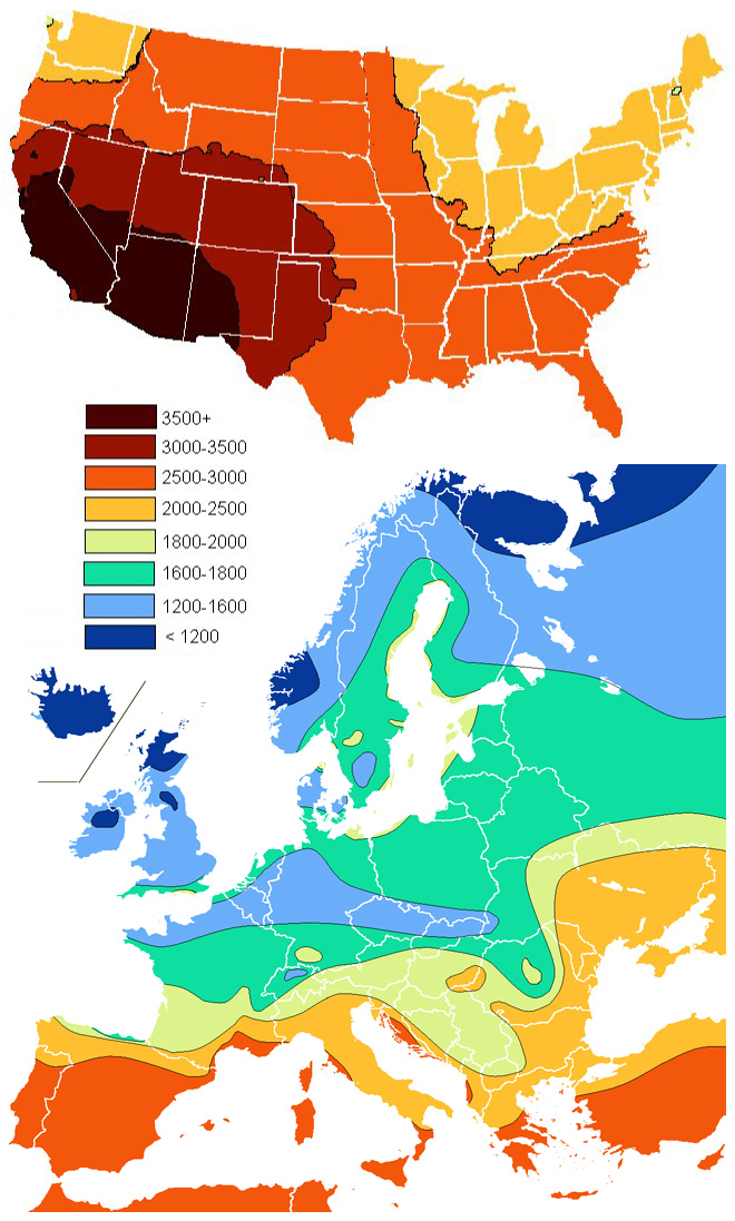 reddit : Sunshine duration in hours per year. USA and Europe"