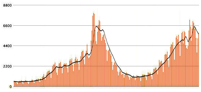 大衆は,この類のグラフを見せられると,「さざ波なんてとんでもない,ひどい大波だ!」のように反応することになる。 こう反応するように洗脳されているからである。 大波に見せるには,トリックがある。 第一に,<全体のどれだけか>を見せないこと。 そして──この第一に比べるとずっと格が落ちるが──第二に,グラフが縦長になるようヨコ幅を狭める。 第二のトリックは,教えてもらえばたいていの者がわかる。 一方,<全体のどれだけか>は,まず理解されない。 日本の人口は,1億2650万人。 この人数に比べて「感染者数」がナンボのものかを考えられる者は,ほとんどいない。 論より証拠,緊急事態宣言に大衆が諾々と従っているというのは,そういうことである。 上のグラフで,「 1万人」がたとえば 10cm の高さになっているとしよう。 このとき「1億2650万人」は,どのくらいの高さか。 この計算には,ほとんどの者が匙を投げてしまう。 小学校で比の計算を苦手にしていたことは,大人になっても変わらないからである。 計算は,つぎのようになる: