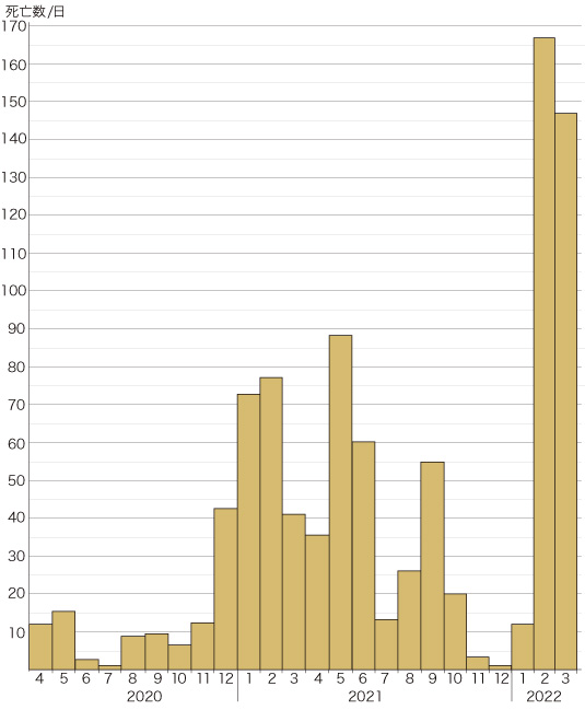 | Up | 死亡数の推移 (累計と1日あたり) : 2022-03-31 まで | 作成: 2022-04-01 更新: 2022-04-01 |