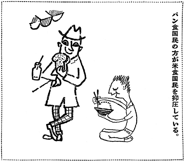 この劣等感が,戦後のアメリカが農産物輸出政策として行ったパン食プロパガンダに嵌まる。