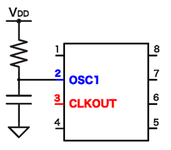 なお、3番ピンを入出力ピンとして使用するか(接続形態2-1)、クロック出力ピンとして使用するか(接続形態2-2)は、コンフィグレーション設定のCLKOUTEN(Clock-out Enable)で設定します。 |