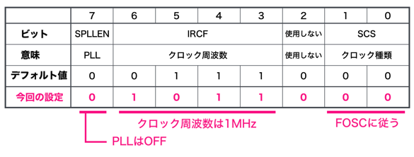 内部クロックを使用する場合にこの値を設定します。この値を設定すると、2番ピンと3番ピンは入出力ピンとして使用できます。ただし精度はそれほどよくありません。 |