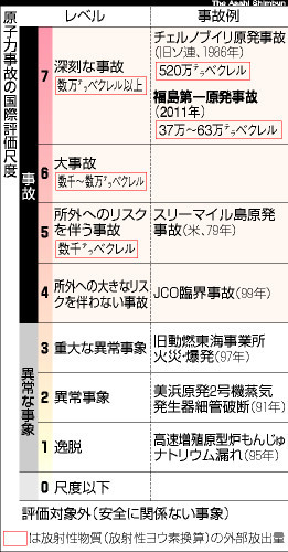 福島原発事故、最悪の「レベル7」に引き上げ 経済産業省原子力安全・保安院は12日、東京電力福島第一原子力発電所の事故について、原発事故の深刻度を示す「国際原子力事象評価尺度(INES)」の暫定評価を、「レベル5」から最悪の「7」に引き上げると発表した。 これまでに放出された放射性物質の量を、推定される原子炉の状態から計算した結果、「7」の基準である「数万テラ・ベクレル以上(テラは1兆倍)」に達した。「7」は0〜7の8段階で上限の「深刻な事故」で、過去では1986年に旧ソ連で起きたチェルノブイリ原発事故が唯一の例だ。 保安院の発表によると、3月11日から4月12日午前11時までに大気中に放出された放射性のヨウ素131とセシウム137の総量を、原子炉の状態から推計したところ、ヨウ素の量に換算して37万テラ・ベクレルに達した。内閣府原子力安全委員会も12日、周辺で測定された放射線量をもとに推計したヨウ素とセシウムの大気への放出総量は、3月11日から4月5日までで63万テラ・ベクレル(ヨウ素換算)になると発表した。保安院の西山英彦審議官は「現時点までの放射性物質の放出量は、チェルノブイリ事故に比べて1割前後で、被曝(ひばく)量も少ない」と違いを強調した。安全委員会によると、現在の放出量は、ピーク時の約1万分の1に落ちている。 (2011年4月12日12時39分 朝日新聞) 福島原発事故、最悪「レベル7」 チェルノブイリ級に 福島第一原発の事故について、経済産業省原子力安全・保安院と原子力安全委員会は、これまでに放出された放射性物質が大量かつ広範にわたるとして、国際的な事故評価尺度(INES)で「深刻な事故」とされるレベル7に引き上げた。原子力史上最悪の1986年の旧ソ連チェルノブイリ原発事故に匹敵する。放射性物質の外部への放出量は1けた小さいという。12日午前に発表した。 保安院は3月11日の事故直後、暫定評価でレベル4としていた。放射性物質が原子力施設外に放出されるような事故はレベル4になり、それ以上は、外部に放出された放射性物質の量でレベルが決まってくる。 18日に79年の米スリーマイル島原発事故に匹敵するレベル5に引き上げた。レベル5は放射性ヨウ素に換算して数百〜数千テラベクレル(テラは1兆倍)の放出が基準だ。その後、放出された放射性物質の総量を推定したところ、放射性ヨウ素換算で37万〜63万テラベクレルになった。INESの評価のレベル7にあたる数万テラベクレル以上に相当した。東京電力によると、全放射能量の1%程度にあたるという。福島第一原発では今でも外部への放出は続いている。 チェルノブイリ事故では爆発と火災が長引き、放射性物質が広範囲に広がり世界的な汚染につながった。実際の放出量は520万テラベクレルとされている。福島第一原発の事故での放出量はその1割程度だが重大な外部放出と評価した。評価結果は国際原子力機関(IAEA)に報告した。 福島第一原発では、原子炉格納容器の圧力を逃がすため放射性物質を含む水蒸気を大気中に放出した。さらに地震後に冷却水が失われ核燃料が露出して生じたとみられる水素によって、1、3号機では原子炉建屋が爆発して壊れた。 2号機の格納容器につながる圧力抑制室付近でも爆発が起こったほか、4号機の使用済み燃料貯蔵プールでの火災などが原因で放射性物質が大量に放出されたと見られている。内閣府の広瀬研吉参与(原子力安全委担当)は「3月15〜16日に2号機の爆発で相当量の放出があった。現段階は少なくなっていると思う」と話した。 東京電力原子力・立地本部の松本純一本部長代理は会見で「放出は現在も完全に止まっておらず、放出量がチェルノブイリに迫ったり超えたりする懸念もあると考えている」と話した。 ただ、原発周辺や敷地の放射線量の測定結果は3月15〜21日に非常に高い値を示していたものの、その後低下している。4月10日に非公開で開かれた安全委の臨時会で保安院の黒木慎一審議官は「最悪の事態は今は脱した」と報告している。
