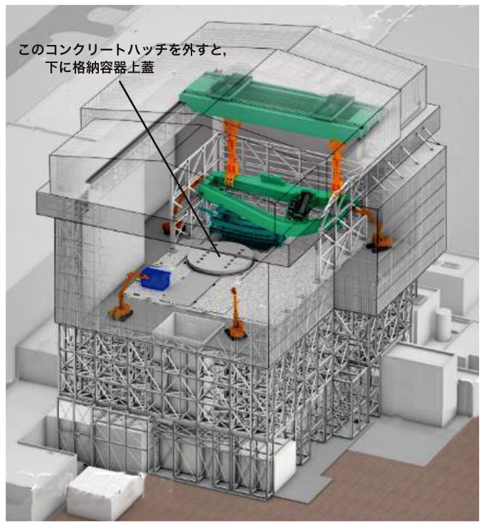 物に貼り付いている燃料デブリを 燃料デブリが貼り付いている物の取り出し口は,大きくなければならない。 何がその取り出し口になるか? 格納容器の上蓋を外し,そして原子炉圧力容器の上蓋を外す。 これが唯一の取り出し口になる。 取り出し作業のメイン機器は,石棺建屋の天井に構築したクレーンである。 格納容器内の物 (圧力容器も含め) を破砕するロボットを下ろす。 破砕のアウトプットである瓦礫を釣り上げ,搬出車に積載する。 しかしこれは,できることではない。 高レベル放射性物質が飛び散ることについては,まだなんとか対策が立つ。 問題は,作業機械のメインテナンスである。 その機械は,高レベル放射性物質にまみれている。 それのメインテナンス・修理は,高レベル放射線の被曝になるので,できない。 よって,作業機械が不調を そして機械は,メインテナンスしなければ必ず不調になるというものである。 |