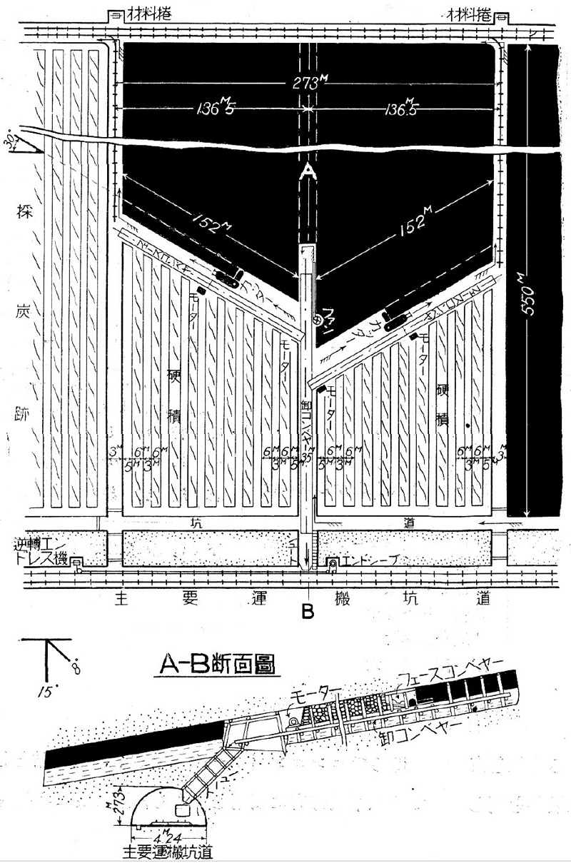各切羽共に,カッターの透し跡には鉄板を敷込んで,石炭をショベルでコンペヤーに刎込み易くし又下磐の混入を防止する。‥‥‥