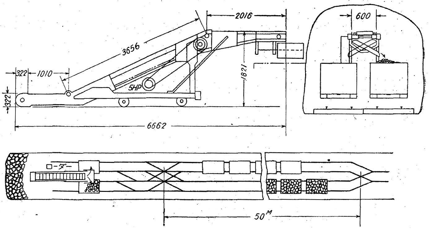 現今一般に使用せられつゝある切羽コンベヤーとしては,此以外に「シヱーカーコンベヤー」「ペルトコンペヤー」等ありて各特長あれ共,當礦に於てはチエンコンベヤー最も適當せるを以て、之れを選びたり。‥‥‥