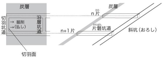 そして,幅 [n片, n+1片] の炭層の掘削を終えたら,[n+1片, n+2片] に移る。