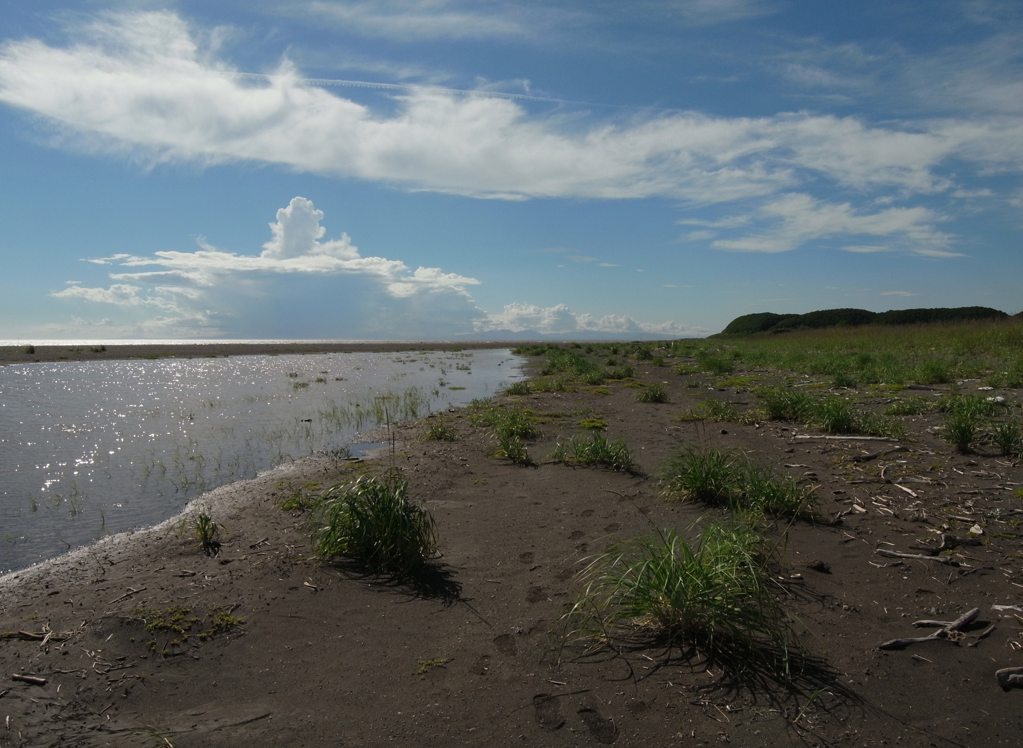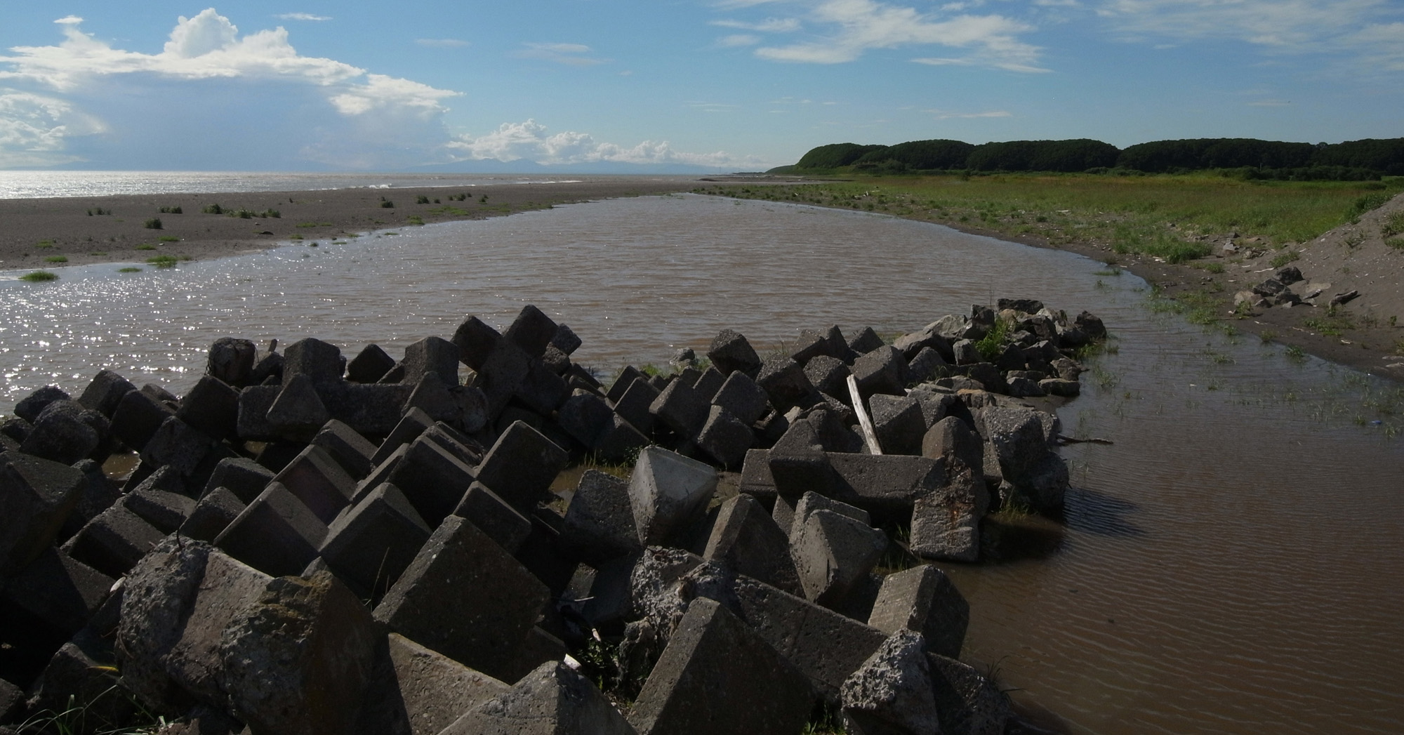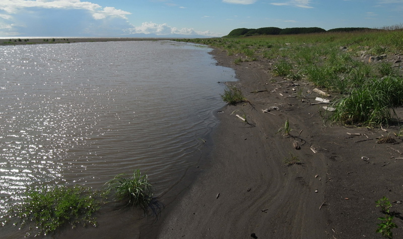 雨による沙流川の増水で,河口の水が浜の中に流れ込んだ。