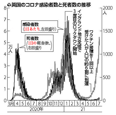 これを放置できないとする政府は,早晩,規制を解除することになる。 「1日の確認された感染者数」は,検査数を増やせば増える。 自粛管制は,きりがない。 よって規制解除する政府は,先ず,感染の危険指標を「1日の確認された感染者数」から「1日の死者数」に変える。 そして,規制解除してだいじょうぶの理由として,「ワクチン接種率」を掲げる。 実際,政府にとっての「ワクチン」の意味は,もともとこれである。 感染は無くならないのであるから,規制解除はマスコミが感染拡大の危険を煽っている中で行うことになる。 このとき規制解除の根拠として使えるものは,「ワクチン接種率」しかないわけである。 そして,「今、再開しなければ、ウイルスが活発化する秋や冬になってしまう」(ジョンソン英首相)。 これは,その通りである。 マスコミに洗脳され切っている者でなければ,新型コロナが季節性感染症であって秋や冬に活性化することを知っている。 イギリスの「1日の感染者数」は,日本と比べて桁違いに多い。 「1日の死者数」も,桁違いに多いときがかつてあり,そしていまも日本より多い。 では,イギリスは規制解除に進み,日本は緊急事態体制を続けているというこの違いは,何なのか。 違いでいちばん大きいのは,国の財政に対する政府の考え方である。 日本の政府は,だいぶ前から,「財政出動」型財政を普通のことにしてきている。 経済の危機には,財政出動で対応する。 コンピュータのキー入力で金を生み出し,救済金としてばらまくのである。 これにより所謂「国の借金」が増える一方となるが,日本の政府は「国の借金」の概念を既に捨てている。 実際,「国の借金」を理論的に説明できる者はいない。 「国の借金」は,幻想だからである。 「国の借金」が幻想なのは,「金」がそもそも幻想だからである。 規制解除に進むイギリスと緊急事態体制を続ける日本の違いは,国民性の違いもある。 日本人は,周りに同調し,そして規則で自分を縛ってもらうのが好きなのである。 主体的になれず,周りに同調する。 裁量を求められるのを嫌い,自分の行動を縛る規則をつくってくれるよう,お上に求める。