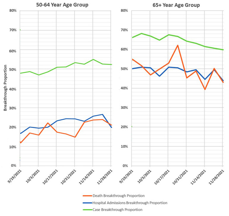 ブレークスルー死亡は,50-64歳ではこの年齢グループの死亡者の 20% 前後で,65歳以上だと 50% 前後。 65歳以上で,つぎを比べてみよう:
