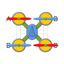 それぞれのローターの回転数を変える事で,機体を前後左右、回転することができる。