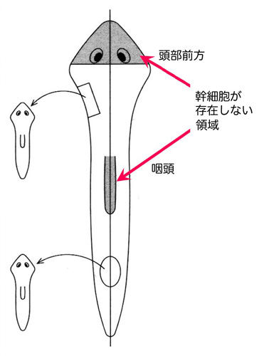 (1)幹細胞を含む領域の (2)背腹を含む 断片からは,全身を再生できる。