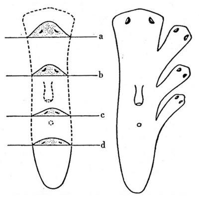 側面に前方に向いた傷をつけた場合、傷の数だけ新しい頭部が形成される。