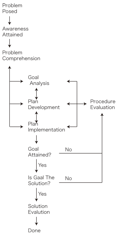 (1.2) "問題解決能力"の措定 (1.3) 問題解決能力機制論──問題解決能力の機制についての論考 (註1)"能力育成"ではなく"能力形成"の言い回しを用いる。"能力形成"の言い回しは日常語的に不自然であるが,合理主義的オリエンテーション下の"能力"解釈では,"能力育成"ではなく正に"能力形成"になる。 (註2) コンピュータ・シミュレーションをつねに念頭においている認知科学内問題解決論では,問題能力を全く内容フリーなものとして直接主題化するということはない。そこで本論では,問題解決能力の主題化を,問題解決能力形成の主題化と併せて,数学的問題解決論に帰属させ,同時に数学的問題解決論を問題解決能力形成論として特徴づける。 2 問題解決過程論 本節では,問題解決過程に対する合理主義的理解の形態を述べる。 2.1 問題解決過程論の記述レベル ここで記述されるのは,問題解決過程として何が起こるかであり,それがいかにして(即ち,どのような機制によって)実現するかではない。──後者は問題解決機制論(§3)になる。 2.2 合理的問題解決過程 合理主義的オリエンテーション下での問題解決過程の理解は,それが合理的な過程だということである")。 (註) 即ち, "1 状況を,明確に定義された属性 property をもった,明確な対象 object によって記述する。 2 対象や属性で記述した状況に適用される一般的ルールを見出す。 3 問題となっている状況に,ルールを論理的に適用して,何をすべきかという結論を導く。 対象や属性の体系的な「表象」を状況にどのように対応づけるか,一般的ルールをどのように知るかというのは,決して簡単な話ではない。しかし合理主義的伝統にあっては,体系的ルールを定式化しさえすれば結論を論理的に導けるという面が強調され,これらの問題は後回しにされている。" (Winograd and Flores,1986,pp.22) 2.3 問題解決過程 問題解決過程は,以下のような図式で理解される:
