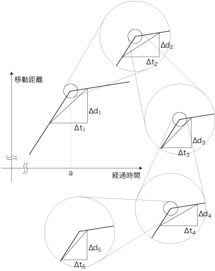 実際,速さがその前後で変わるところでは,速さは存在しない。 特に,<時間─距離>のグラフを折れ線で近似したときの折れ線の角にあたるところでは,速さが存在しない: