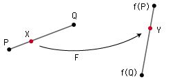 Aの頂点 P, Q と辺 PQ の上の点 X において v(P, X) = v(P, Q) x t であるとき,v(f(P), Y) =v(f(P), f(Q)) x t を満たす Y を,F(X) と定義する。