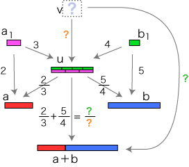 さて,数の和は 倍の和として定められます。 そこで分数の場合,つぎのようになります (倍は,長方形のヨコの長さに関する倍):