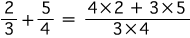特に,(2/3)+(5/4) は,(4×2)/(4×3)+(3×5)/(3×4) になります。
