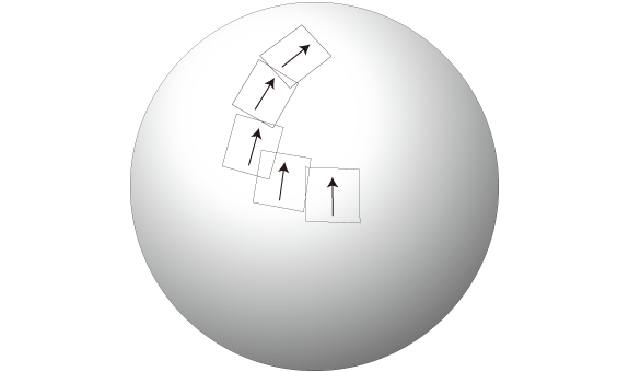 \(P\) から \(P'\) への移動では,経路の各点でその都度接平面を設定し,その上で座標の平行移動を行っている。