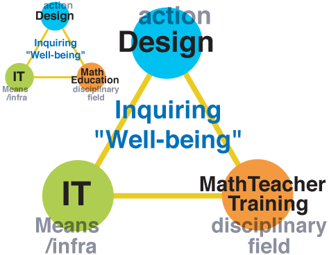 I approach it with the triangular scheme, with "action", "means/infrastructure" and "disciplinary field" being the vertices. And to each, I correspond "design", "IT", that is information technology, and "Mathematics Education".