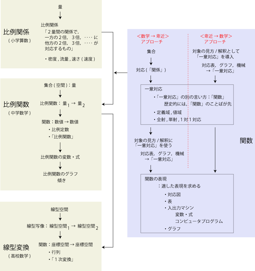 学校数学に「関数」を組み入れる形は,構成の論理により,だいたい決まってくる。 すなわち,つぎのようになる: