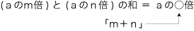 数の和は,「aのm倍の量とaのn倍の量を合わせると,aの○倍」の「○」を表現する対象式として導入される。 ──自然数,分数,正負の数,複素数,‥‥ の和は,この条件を満たすように定義される。