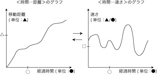 ![]() ヒントは,「等速運動の場合」である。 等速運動であれば,小学算数の比例関係の問題になる。 実際,小学6年生はつぎのことができる: ![]() さて,これがどんなヒントになるのか? 註:「等速」の<時間─距離>グラフが直線になるのはどうして?