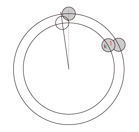 黄金角の回転では,「k跳びでn個一巡」の<n番目>が回転の開始点にきて,かつ開始点と少しずれる。 そこで,<一段下げた円で同じプロセスを再開>をフラクタル構造にすると,渦巻き模様が現れる。