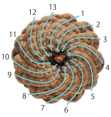 これを一例に,植物の形態形成では,フィボナッチ数を現すフラクタル性がいろいろ見出される(らしい)。 そこで,「これはどうしたことか?」「フィボナッチ数にどんな秘密が?」となるわけである。 しかしこの話題では,「秘密」はフィボナッチ数にではなく,黄金角にあるとしなければならない。 実際,渦巻きなら,任意本数で描くことができる。 「黄金角跳び回転」の中で出てきた「k跳びでn個一巡」も,「nとkが互いに素」が条件になることであって,フィボナッチ数に理由を求めることではない。 つぎが「植物の形態形成とフィボナッチ数」の考え方になる: