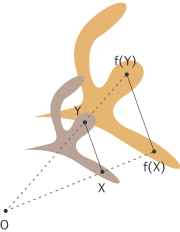 X と Y の距離と f(X) と f(Y) の距離の比は,Oと X の距離と Oと f(X) の距離の比に同じ。