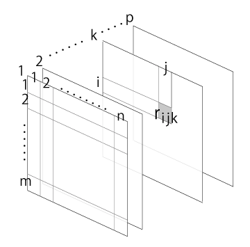 この関係は,\( r_{(ij),k} \) の表現になり,結局 \( r_{ijk} \) の表現になる。 そしてこれは,3次元の表をつくったことになる:
