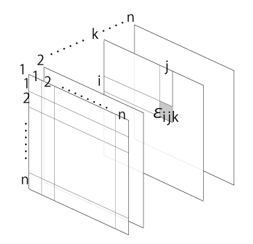 「\(\epsilon\) テンソル」の \(\epsilon_{i\,j\,k}\) は,つぎの立方超行列の中に配置できる: