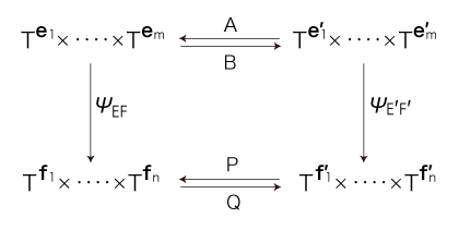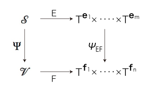 関数 \( \psi_{EF} : T^{{\bf e}_1} \times \cdots \times T^{{\bf e}_m} \longrightarrow T^{{\bf f}_1} \times \cdots \times T^{{\bf f}_n} \) は,