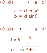 高校で複素数を習ったひとは,実はこの2つの表現とその換算法も学習しています。 (しかしほとんどのひとは,これの意味を知らないで/意識しないで過ごしてきています。)