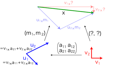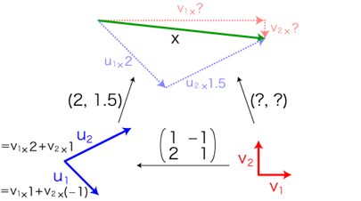 基底 (u1, u2) に対するベクトルxの値が (2, 1.5) であるとします。そして,