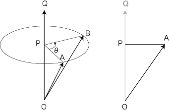 Q の座標 (qx, qy, qz),A の座標 (ax, ay, az),角度θ に対する B の座標 (bx, by, bz) は,以下のようにして求めることができます: