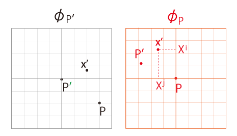 - \(\phi_P\) での \(P'\) の座標を \( ({X}_0^i) \) とする。